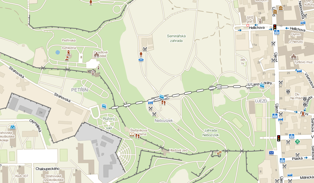 pěšky ze stanice MHD – Újezd ( tramvaje 12, 20, 22 ),